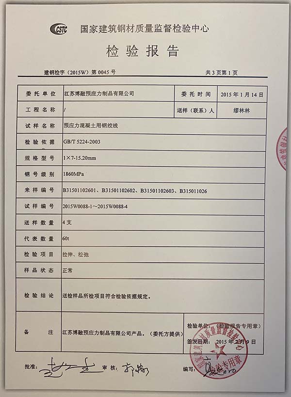 ——贵公司生产的低松弛预应力钢绞线1X7-15.20mm、1860MPa在我公司建造的 S229 姜堰段改扩建工程中,完全满足了施工的需要。在工程建设期间,双方通力协作,责公司钢绞线材质稳定、质量优良、按时供货,为工程做出了重要的贡献。希望我们的合作在今后得到进一步的发展。