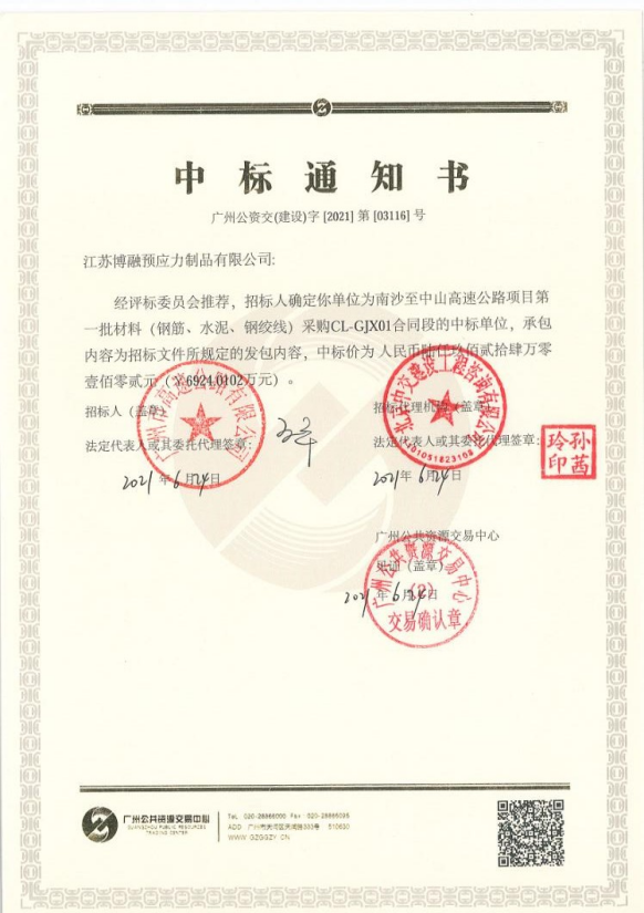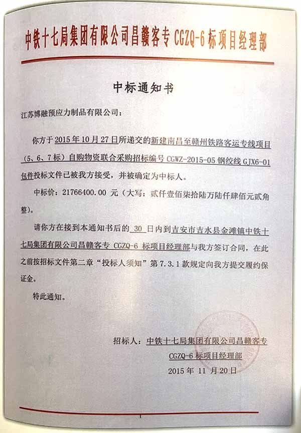 ——招标评标结果公示江苏博融预应力制品有限公司:你方于2015年10月27日所递交的新建南昌至赣州铁路客运专线项目(5、6、7标)自购物资联合采购招标编号CGWZ-2015-05钢绞线GJX6-01包佳投标文件已被我方接受,并被确定为中标人。中标价:21766400.00元(大写:贰仟壹佰柒拾陆万陆仟肆佰元贰角请你方在接到本通知书后的30日内到吉安市吉水县金滩镇中铁土七局集团有限公司品赣客专CGZ06