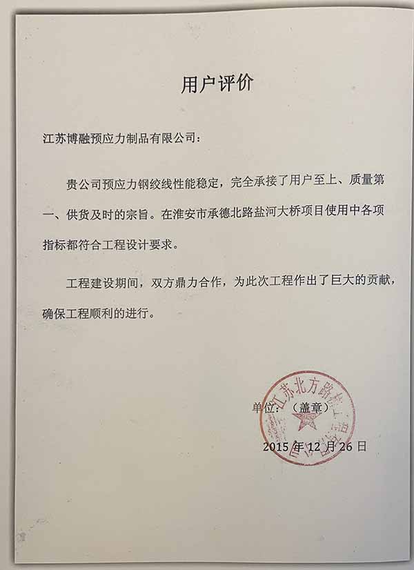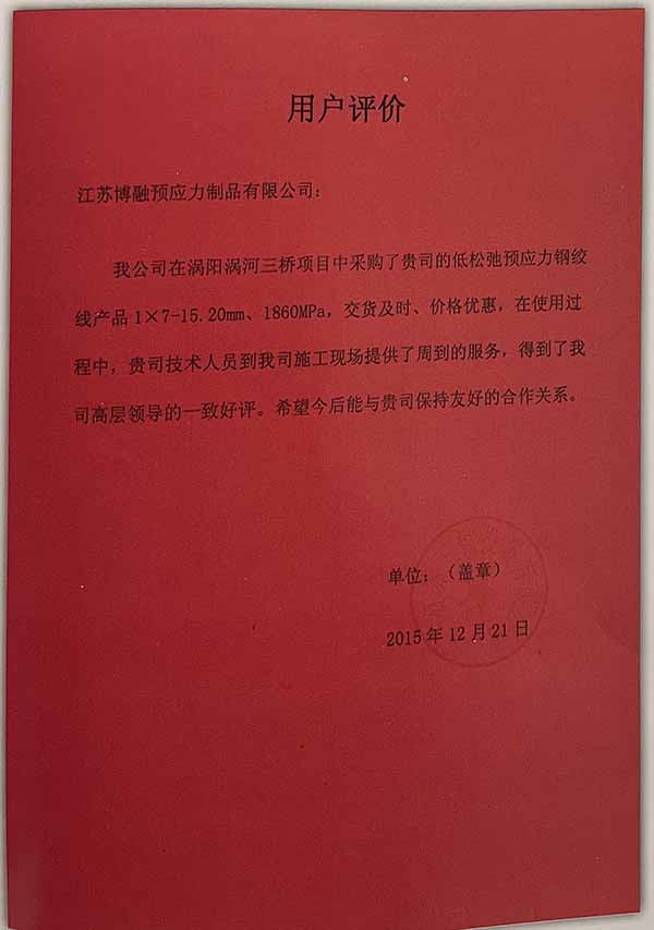 ——江苏博融预应力制品有限公司:我公司在涡阳涡河三桥项目中采购了贵司的低松弛预应力钢绞线产品1x7-15.20mm、1860MPa,交货及时、价格优惠,在使用过程中,贵司技术人员到我司施工现场提供了周到的服务,得到了我司高层领导的一致好评。希望今后能与贵司保持友好的合作关系