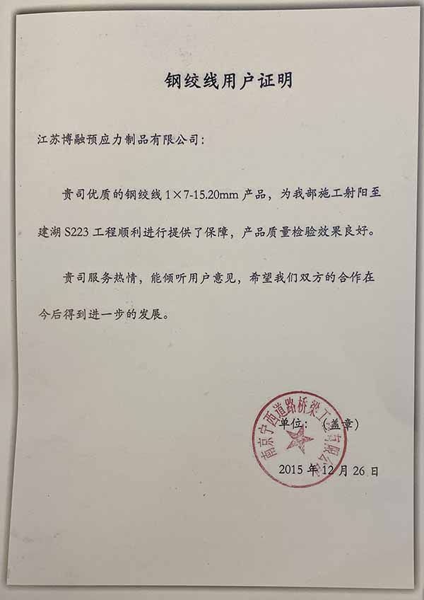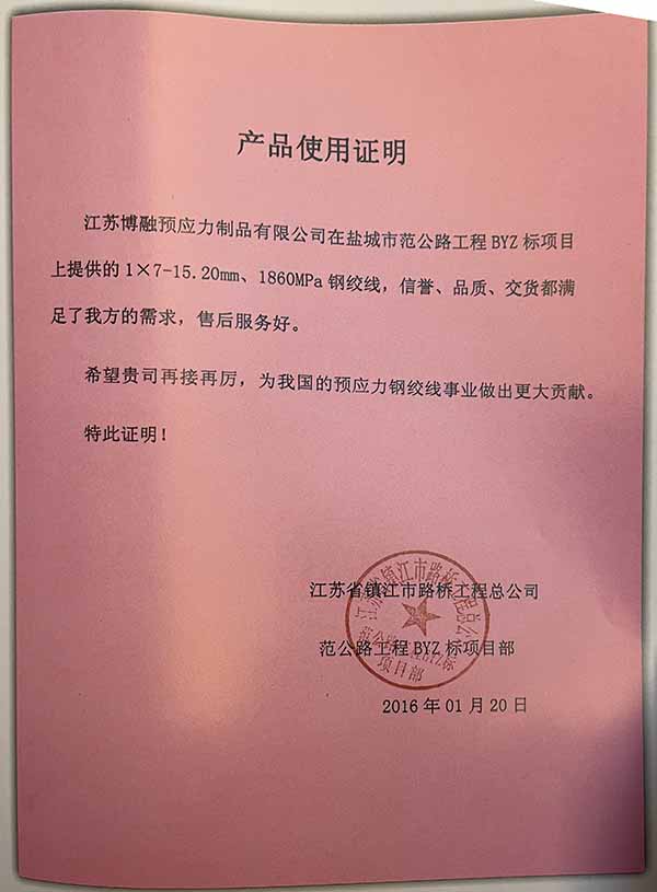——江苏博融预应力制品有限公司在盐城市范公路工程 BYZ 标项目上提供的1x7-15.20mm、1860MPa 钢绞线,信誉、品质、交货都满足了我方的需求,售后服务好。希望贵司再接再厉,为我国的预应力钢绞线事业做出更大贡献。特此证明!