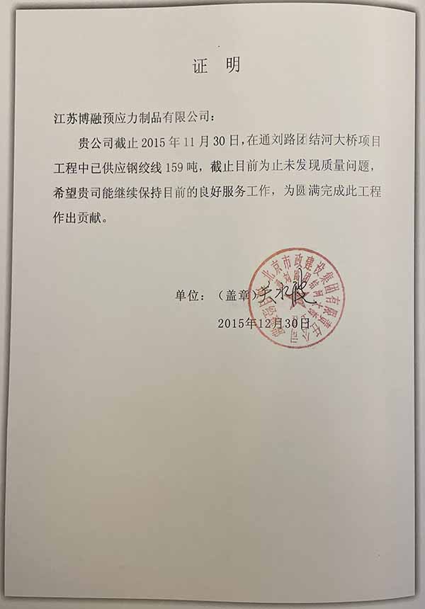——江苏博融预应力制品有限公司:贵公司截止2015年11月30日,在通刘路结河大桥项目工程中已供应钢绞线159吨,截止目前为止未发现质量问题,希望贵司能继续保持目前的良好服务工作,为圆满完成此工程作出贡献